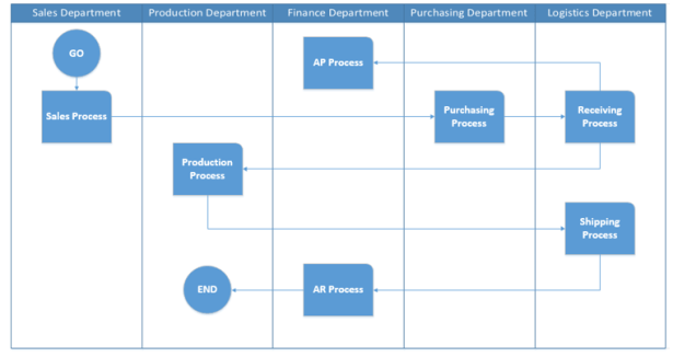 VD. Với quy trình “Sales Process”, ta có thể vẽ các quy trình con theo phòng ban như sau: Quy trình chính: Quote to Sales Order